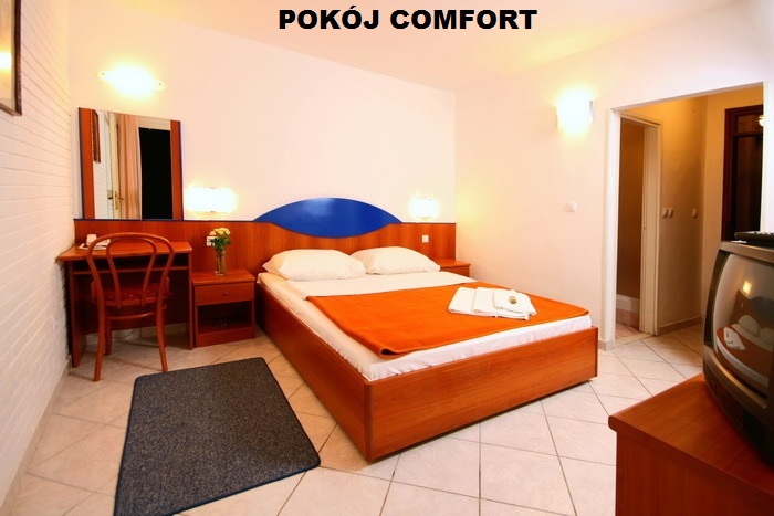 pawilonu, w którym mieści się recepcja. Plaża: skalista (płaskie kamienie), oddalona do ok. 5 min. pieszo od ośrodka. Niedaleko kamienisto-żwirowa i wybetonowana. Basen: odkryty z wodą morską i brodzik dla dzieci. Leżaki (w cenie/ograniczona liczba). Zakwaterowanie: W ośrodku znajdują się apartamenty w pawilonach: 2* - typ "komfort" oraz apartamenty 4* - typ "delux". APARTAMENT 1/2+1**, STUDIO, KOMFORT (66538): mini aneks kuchenny, SAT-TV, telefon, łazienka/WC, wiatrak, balkon lub taras. APARTAMENT 1/2+2**, KOMFORT (12806): sypialnia dla 2 osób, pokój dzienny z rozkładaną sofą dla 2 osób, aneks kuchenny z jadalnią, SAT-TV, telefon, łazienka/WC, wiatrak, balkon lub taras. APARTAMENT 1/4+2**, KOMFORT (12821): 2 poziomy; 2 sypialnie dla 2 osób (na wyższym piętrze), pokój dzienny z rozkładaną sofą dla 2 osób, aneks kuchenny z jadalnią, SAT-TV, telefon, łazienka/WC, wiatrak, balkon lub taras. Wyżywienie: brak. Możliwość wyżywienia samych śniadań, lunchu (wybór spośród 3 pozycji w menu) lub obiadokolacji za dopłatą. *wyżywienie jest możliwe jeśli wykupione będzie dla wszystkich osób w apartamencie. Ośrodek dysponuje: restauracja, bar przy basenie (08:00-23:00), parking (w cenie), wymiana walut, animacje (w sezonie), internet WiFi (odpłatnie), całodobowa recepcja, salon piękności (odpłatnie), sejf w recepcji (w cenie). Sport: w cenie: mini-siłownia. Odpłatnie: korty tenisowe, tenis stołowy. Zwierzęta: dozwolone (odpłatnie) Godzina zakwaterowania / wykwaterowania: 16:00 / 10:00 |